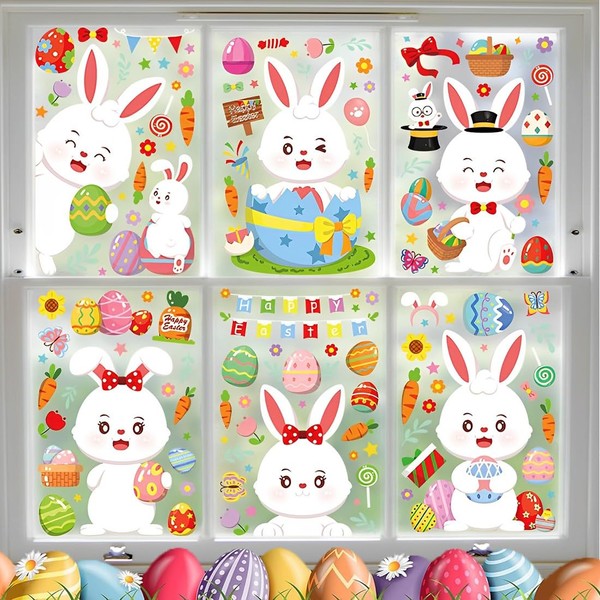 JEYORZY 6 Blätter Fenstersticker Ostern Selbstklebend, Fensterdekoration Ostern mit Hasen Ostereier Küken, Fensterbild Ostern, Fenster Aufkleber Dekorationen Wiederverwendbar für Ostern