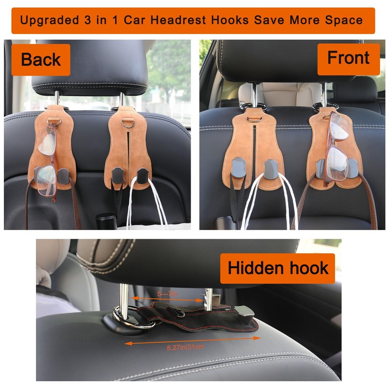 - Bendable Leather Car Headrest Hook:The body of the car hooks is crafted with quality faux leather material,high toughness.and can be bent freely and suitable for the types of car seats without harming your car.Universal car bag hooks are good choice for your long trips and daily appearances to organize easily your belongings