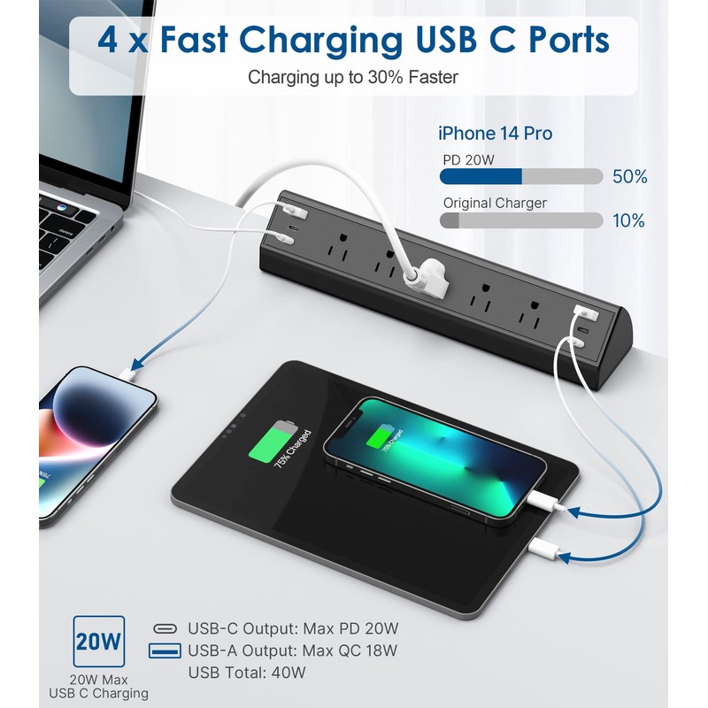 - Home Improvement Must Haves: The Desktop Mount Surge Protector is tailored to provide home improvement must-haves, offering a total 40W fast charging station with 4 PD 20W USB-C ports, 2 USB A ports, 5 widely spaced outlets,6FT flat plug to protect your devices from overcharging, and overloads.1200 Joules energy rating. made of fireproof plastic material.