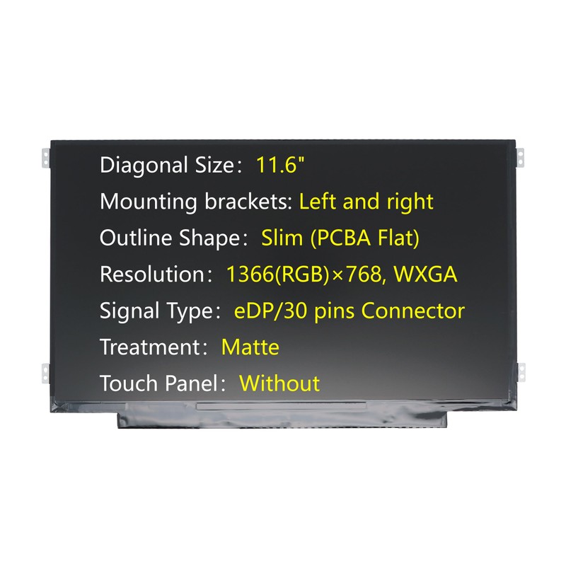 - Diagonal Size:11.6"; Mounting brackets: Left & Right; Shape Style:Slim (PCBA Flat); Resolution:1366(RGB)×768, WXGA; Signal Interface:eDP/30 pins Connector; Treatment:Matte; Touch Panel:Without;