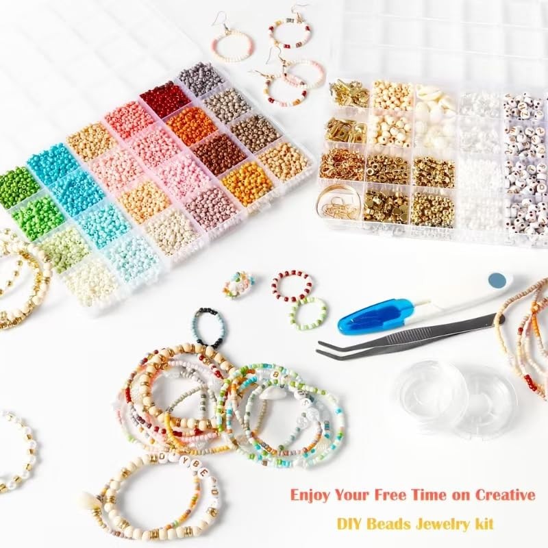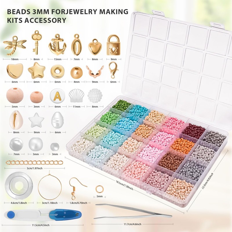 - Valuable glass bead jewellery making set: JHWELRG bracelet with beads contains: 12000 pieces 3 mm glass beads; 260 wooden beads; 310 white beads; 50 golden smiley beads; 350 golden letter beads and other jewellery accessories made of galvanised metal (quantity and style depend on the picture). Bobbins, scissors, tweezers, glass bead set in a complete set to meet your jewellery making needs. All in one storage box.