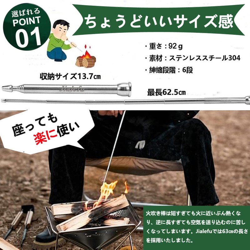 Jialefu Bellows Fire Blowing Rod, Fire Starter, Bonfire, Blower, Barbecue, Fireplace, Charcoal, Firewood, Stainless Steel, Durable, Stretchable, Compact Portable, Sash Pockets, 6 Tiers, Storage Box Included