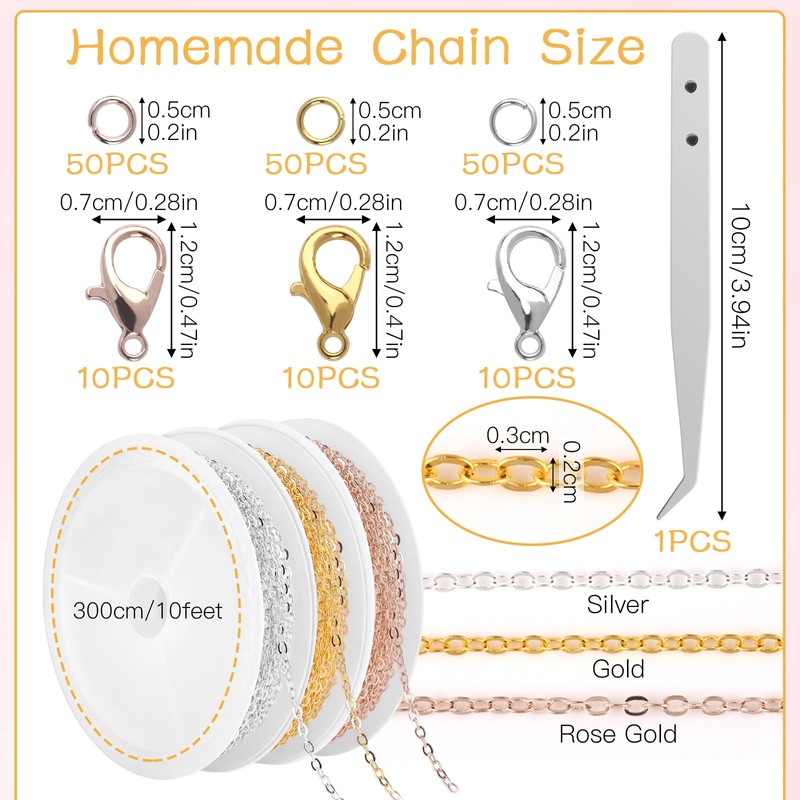 - DIY chain set: the jewellery making chain kit contains 1 roll of 300 cm rose gold cable link chain, 1 roll of 300 cm gold chain and 1 roll of 300 cm silver chain, 30 lobster clasps and 150 jump rings, 1 jewellery pliers. Chain specification: 3 x 2 mm (length x width), lobster clasp: 1.2 x 0.7 cm, open ring: 0.5 cm. Jewellery clasps chains craft different colours can meet your daily needs. Ideal for DIY jewellery making and repairing necklaces.