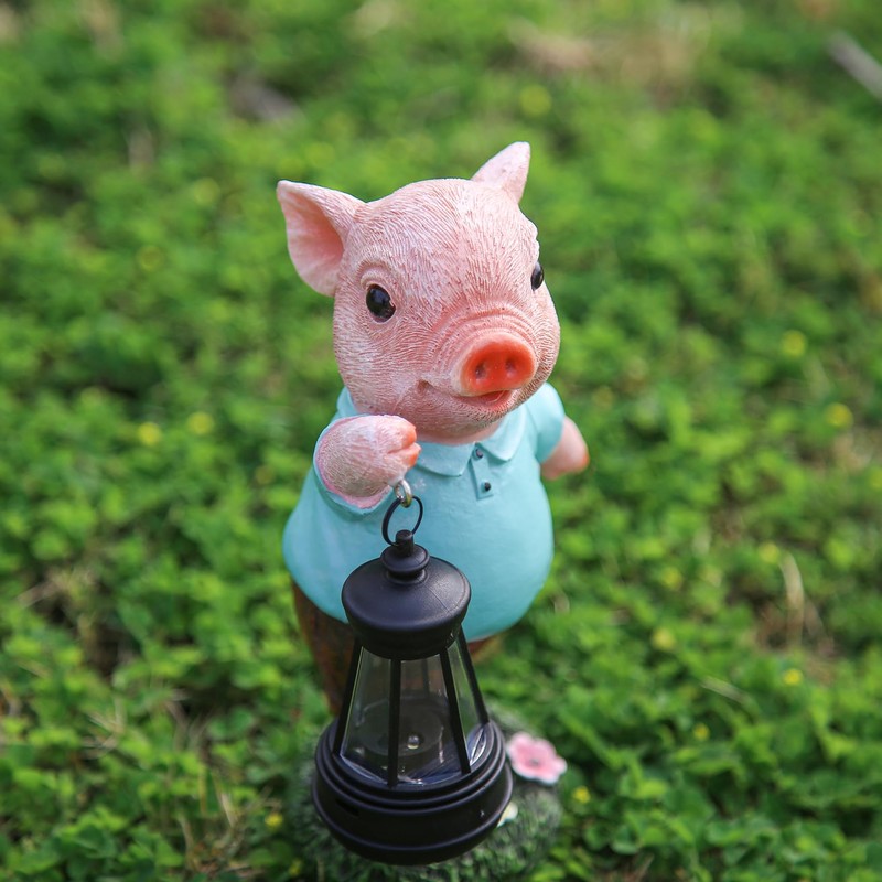 - CHARMING DESIGN: Adorable pig figurine wearing a turquoise polo shirt and brown pants, holding a classic-style lantern adds whimsical charm to any garden space