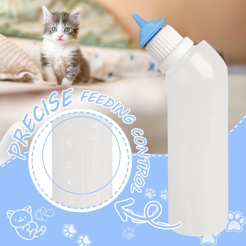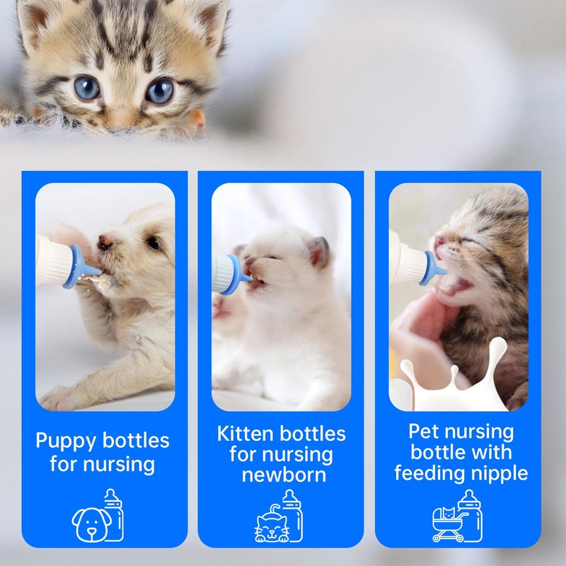 - Package Included :5pcs pet nursing bottle with mini blue nipple ,1pcs measure cup.Kitten bottle feeding kit is designed for kittens and puppies that cannot be fed by their mother. Pet Bottles are suitable for kittens under 6 weeks old.