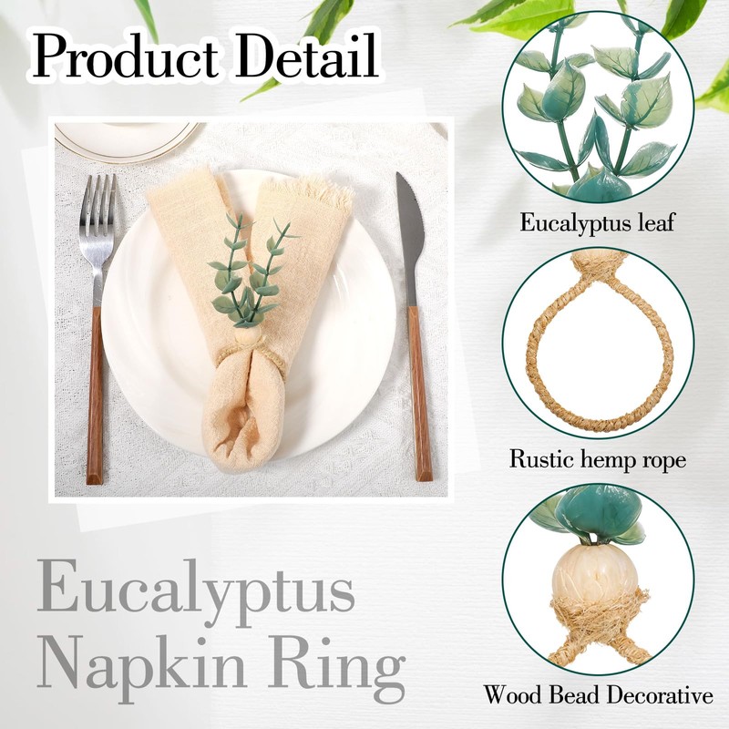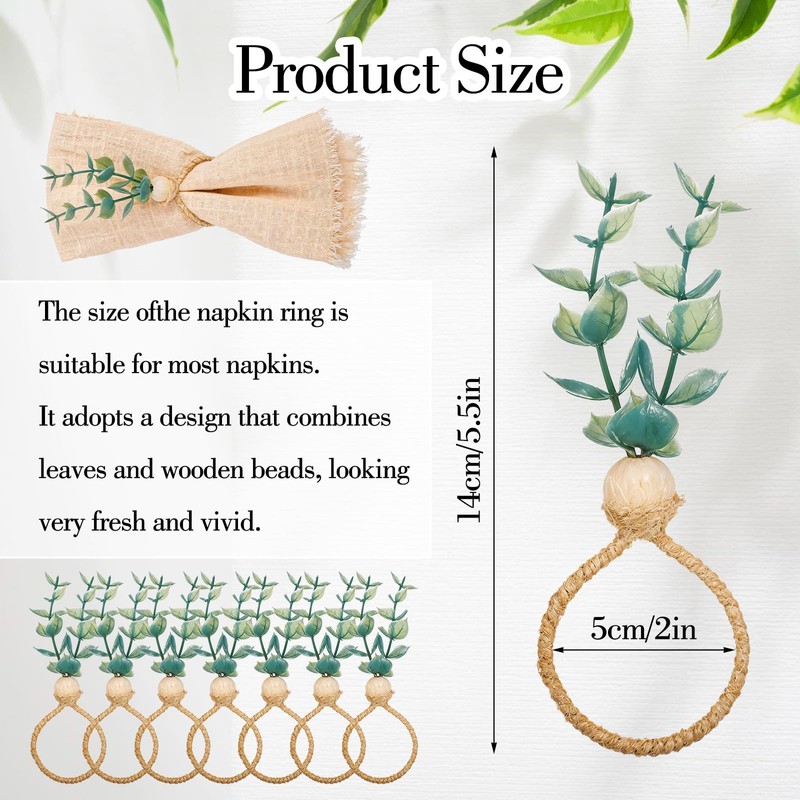 - 【Rustic Farmhouse Design】Each napkin holder combines faux eucalyptus leaves with a wood bead, embodying a rustic farmhouse style that enhances boho or nature-themed tables. The greenery and wooden elements evoke an organic, earthy feel, suitable for both indoor dining rooms and outdoor picnics. The handcrafted aesthetic adds artisanal charm without overwhelming other decor.