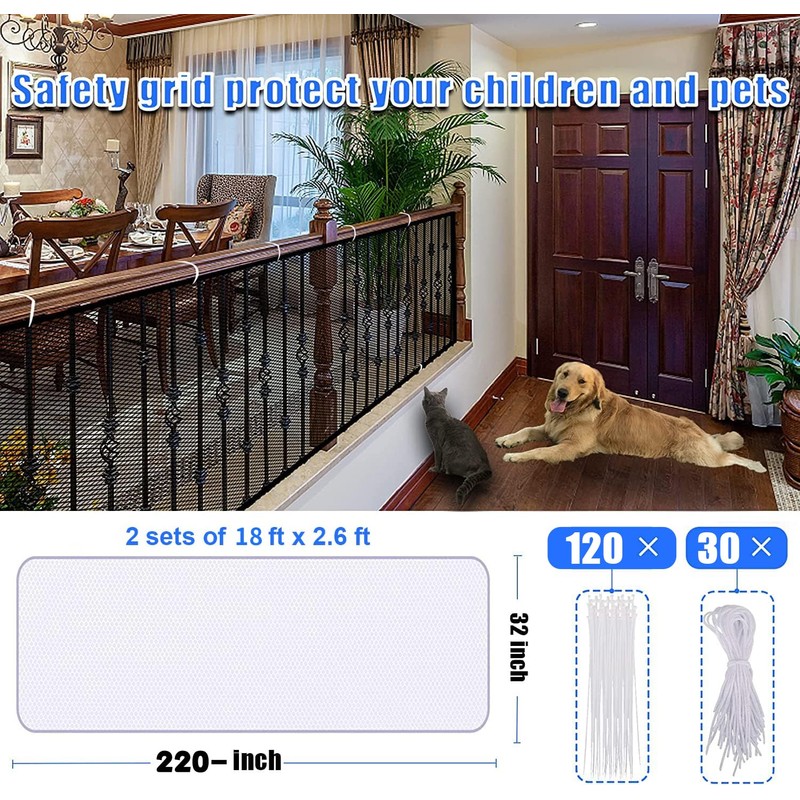 - 【Package Include】Including 2 pieces 18ft L x 2.6 ft H/220× 32 inch/5.6× 0.8m banister guard with 120 pieces of zip ties and 30 pieces lashing rope. Please check the actual dimensions of the net before purchasing to ensure a proper fit for your needs