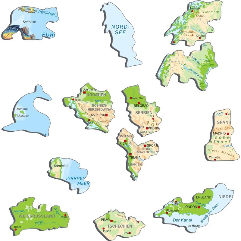 - Contour pieces – the puzzle pieces are cut as far as reasonably possible along borders and coastlines.