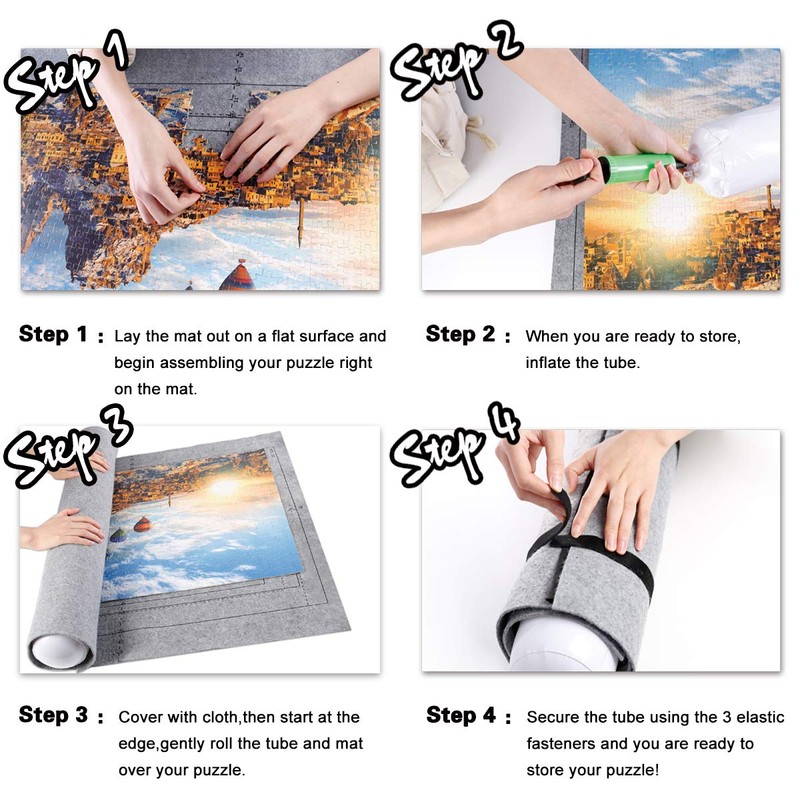 - 【Easy To Use It】Our puzzle saver mat kit is optimized for easy use and convenience. That's why it is designed to be packed in a single minute with 4 steps: first inflate the tube - then roll up the puzzle mat - after that tie up three bands - finally put it into the bag. That's it! Pretty easy right?!
