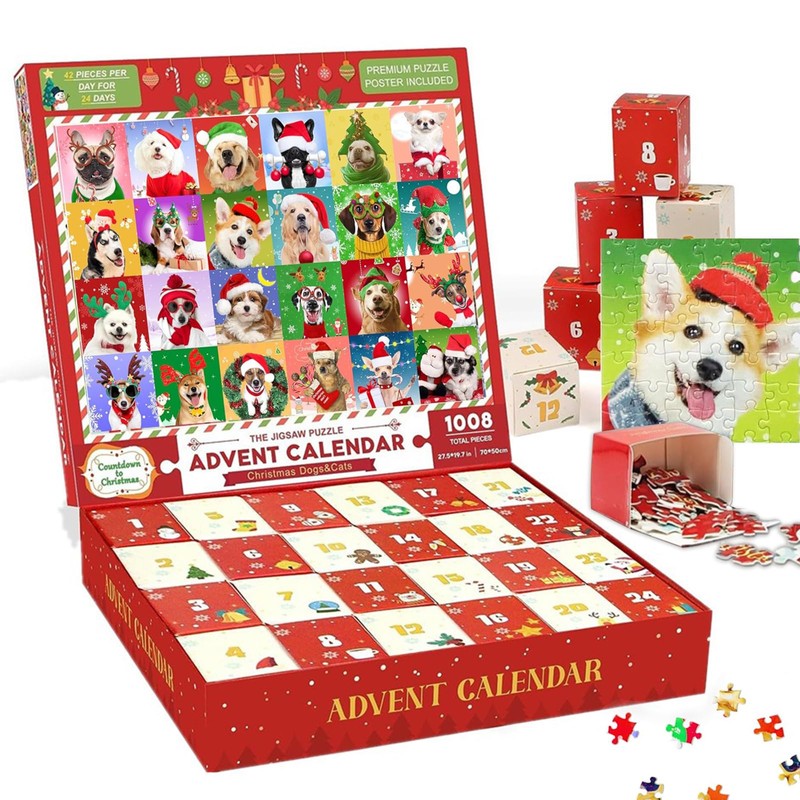 Jigsaw Puzzles Advent Calendar 2024 -Christmas Dogs,24 Boxes 1008 Pieces Puzzles Countdown to Christmas for Kids Adults,Xmas Gifts Stocking Stuffers (red)