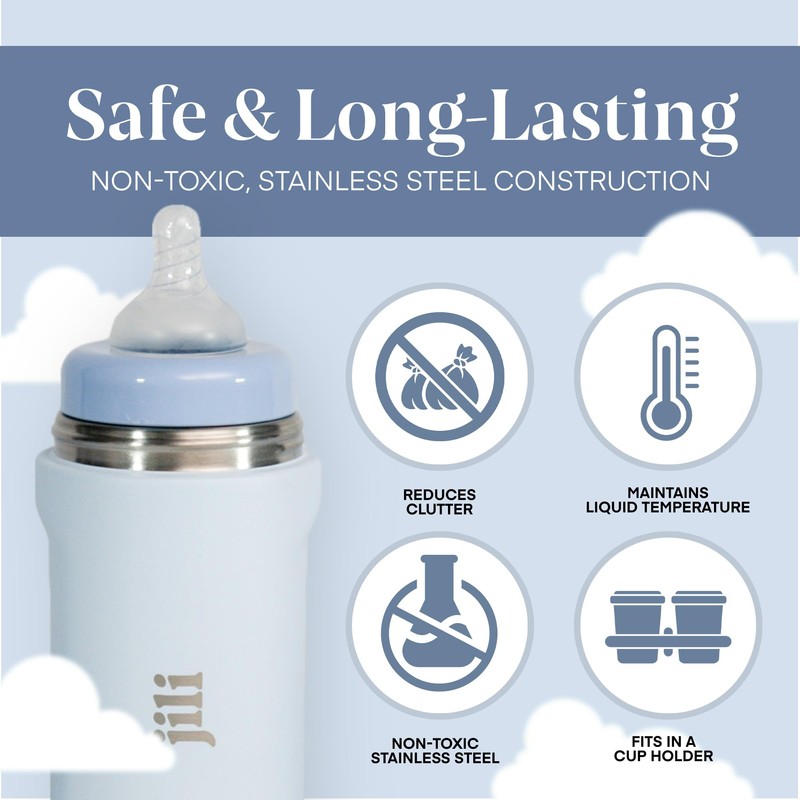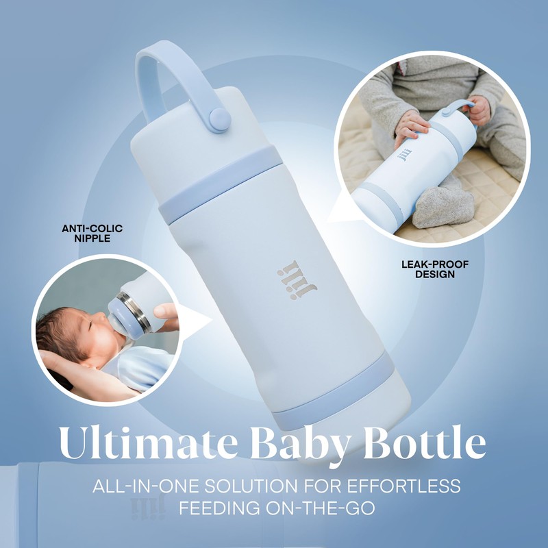 Jili All-in-One Baby Bottle, Insulated Stainless Steel Bottle with Formula Container, Anti-Colic Nipple, and Leak-Proof Lid, Baby Essentials for Travel, BPA, Parabens, and Phthalate-Free, Ice, 11 oz.