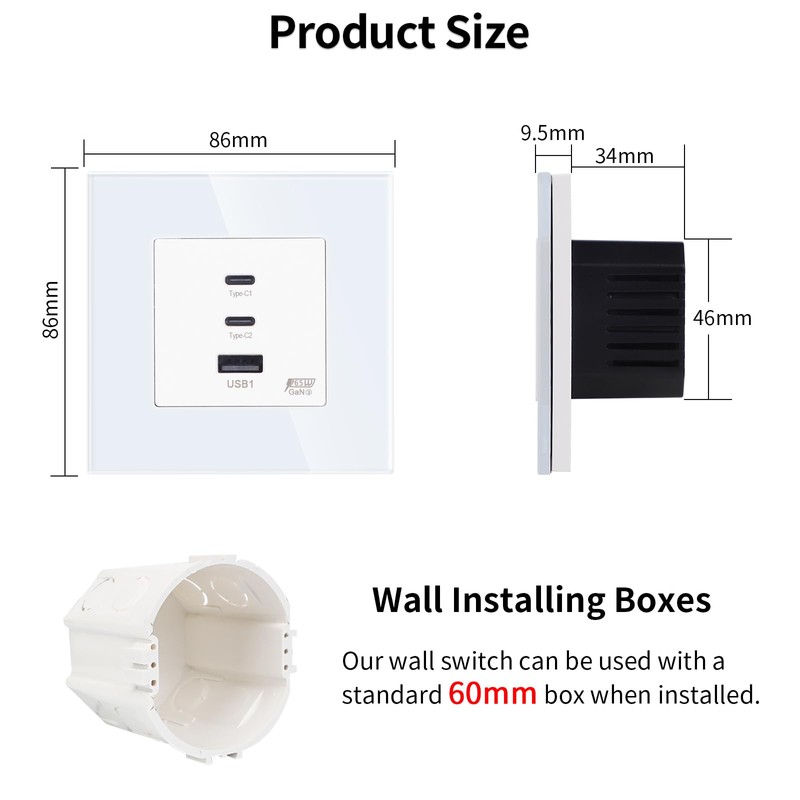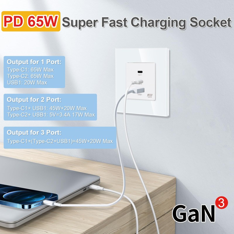 JIMEIDA Socket White 65 W Quick Charge 2 Type-C and 1 USB-A Interface Flush-Mounted Glass Socket 86 x 86 mm