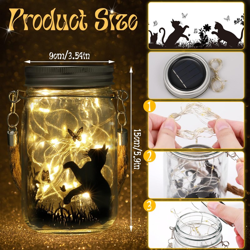Jingmore 3 Pcs Fairy Solar Lights Lantern Garden Outdoor Yard Ornament Lights Waterproof Fairy Hanging Glass Jar Lights for Tree, Table, Yard, Garden, Patio, Lawn Room (Cat)