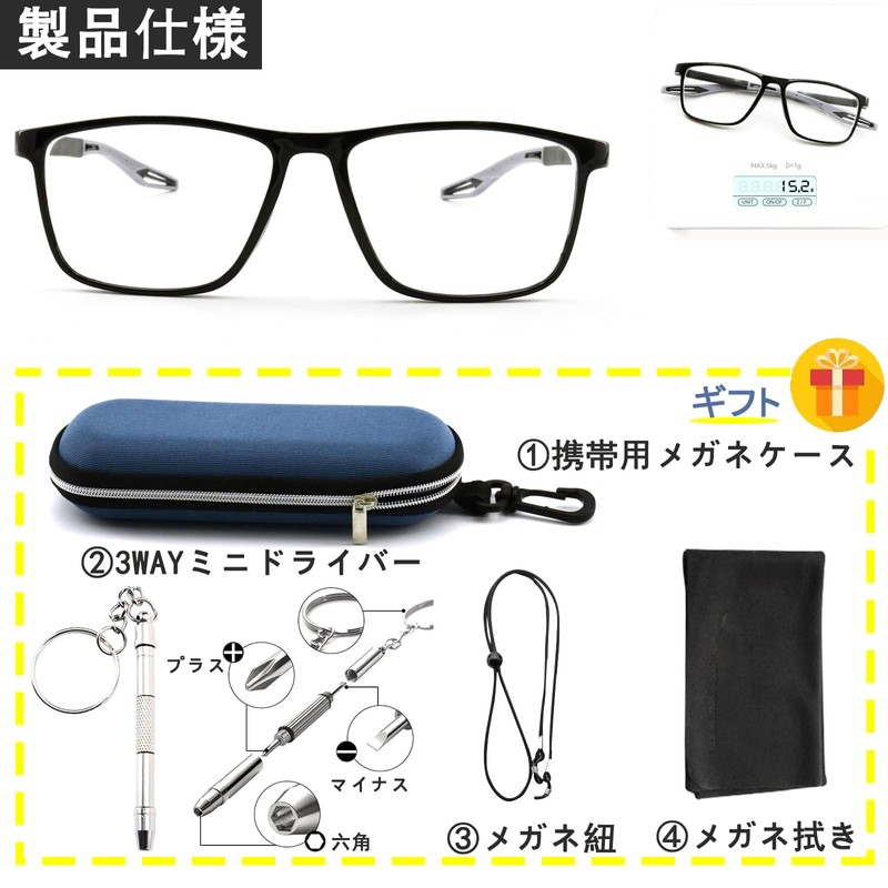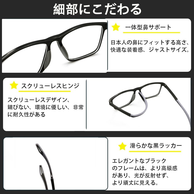 - 【超軽量TR90フレーム材質】フレームは、最先端のTR90材質を使用しています。TR90は超軽量で強靱な特性を兼ね備え、長時間着用も負担を感じさせません。同時に、柔軟性に優れて、形状復元性も高いため、変形や損傷を軽減し、長期間の使用を保証します。