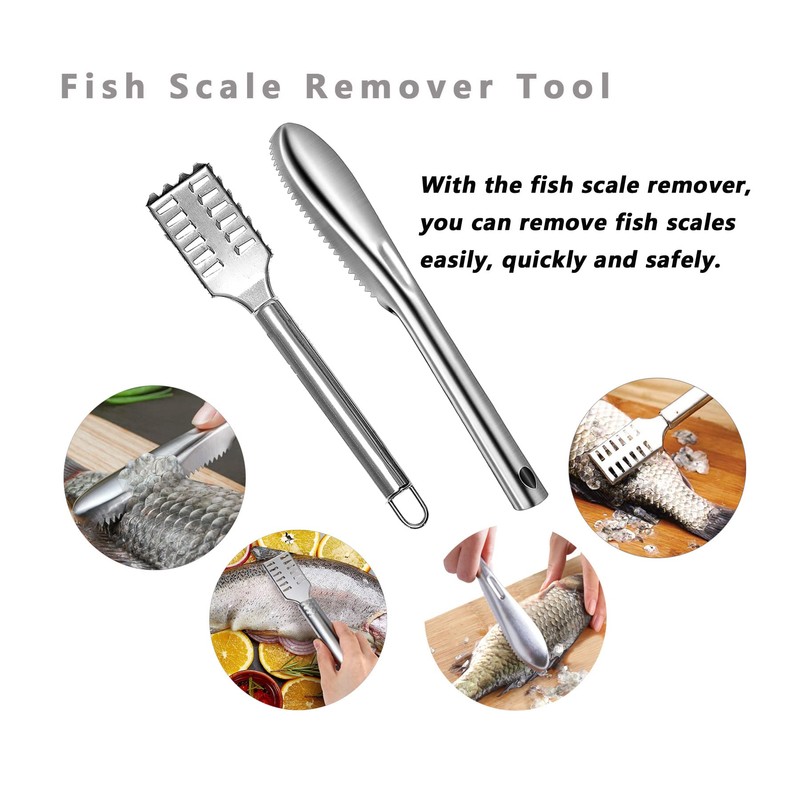 - Space-saving and easy to clean: fish scaler set, the design of the hanging hole is convenient for storage and does not take up space. The fish scale remover can be easily cleaned. Dishwasher safe.