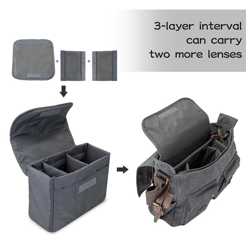 - Adjustable inner bladder partition.The detachable partition board is attached to the lining board,and the position can be adjusted at will. Make reasonable use of space to secure the camera accessories firmly in place.