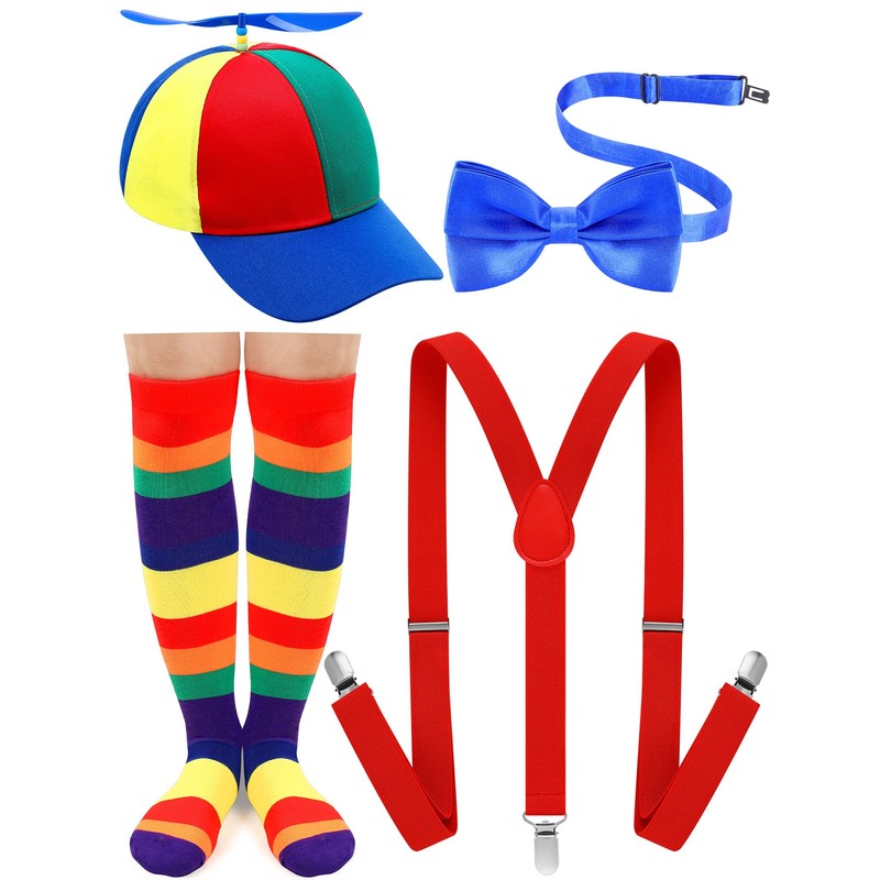 - Size Information: the rainbow propeller hat is about 22 Inches/ 56 cm in head circumference, the bow tie is adjustable for a comfortable fit, the suspender is about 39.37 inches/ 100 cm long and 0.98 inch/ 2.5 cm wide, the tube socks are about 14 inches/ 35.56 cm long, suitable for most men and women to wear