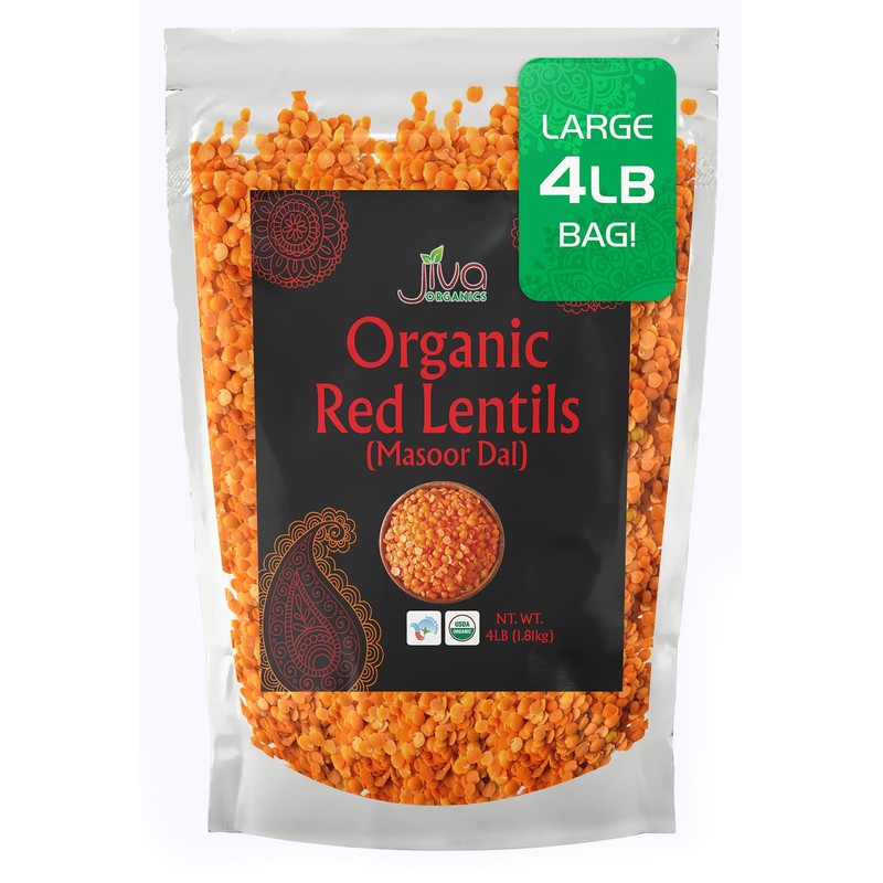 Jiva Organic Split Red Lentils 4 Pound LARGE Bag - Masoor Dal - Non-GMO, Vegan, Certified, Non-Irradiated