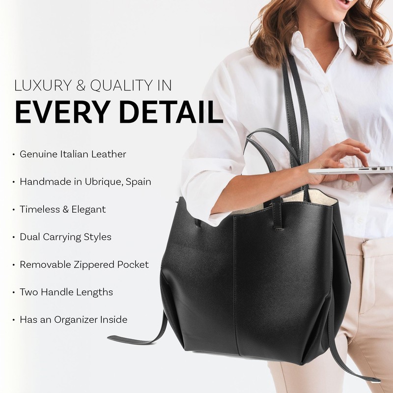 - 𝗤𝗨𝗔𝗟𝗜𝗧𝗬 𝗖𝗥𝗔𝗙𝗧𝗦𝗠𝗔𝗡𝗦𝗛𝗜𝗣: These leather totes are handmade by leather goods artisans in Ubrique, Spain, and combine traditional workmanship with modern design. It's a luxury tote bag for women known for its superior craftsmanship and luxurious feel.