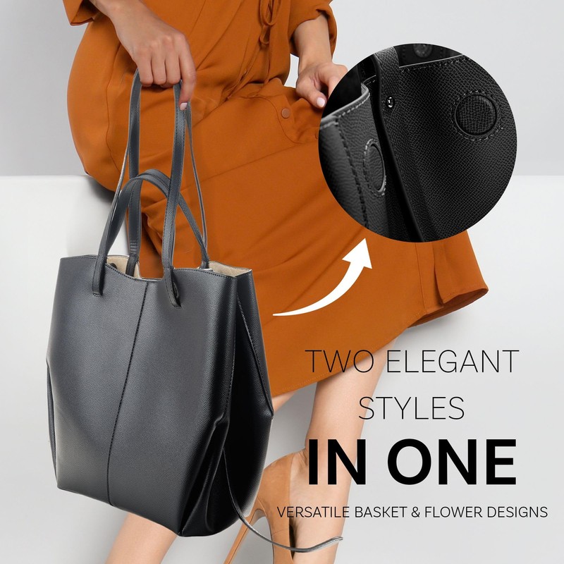 - 𝗩𝗘𝗥𝗦𝗔𝗧𝗜𝗟𝗘 𝗗𝗘𝗦𝗜𝗚𝗡 𝗢𝗣𝗧𝗜𝗢𝗡𝗦: Enjoy the versatility of two stylish looks, as it can be used in two ways: basket-style with open sides or a flower-shaped closed purse with crossed straps inside. This large leather tote bag for women is ideal as a leather work tote or an elegant purse for any event.