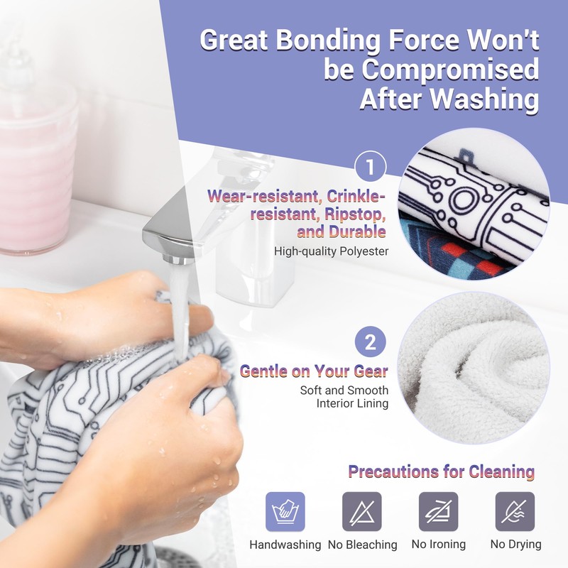 Die Hülle ist aus hochwertigem Ripstop-Gewebe gefertigt, das verschleißfest und knitterarm ist und jahrelang zuverlässig funktioniert. Die Außenseite aus Mikrofaser kann Flecken oder Wasserflecken auf Bildschirmen oder anderen Geräten abwischen, während das weiche und glatte Innenfutter Ihre Geräte schont.