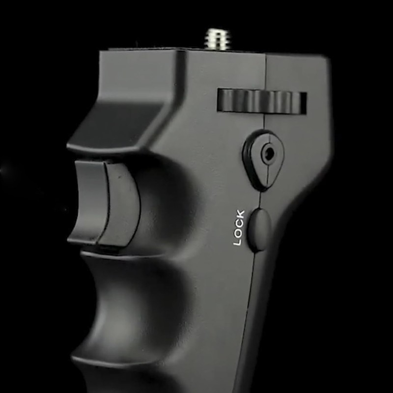 The grip is simply screwed into the tripod thread of the camera and connected with the included cable. The lock button also gives you the option to pause the release mode. If it is activated, the camera releases once to confirm and is then locked and unlocked with the press of a button. Additionally a 1/4" inch thread can be found on the bottom, so the camera and grip can be mounted on a tripod.