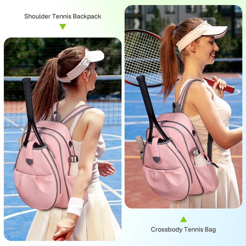 - 【Adjustable Straps】Tennis sling crossbody backpack features adjustable shoulder straps with a front zipper design for easy switching between shoulder carrying styles. Two hooks at the bottom allow flexible strap direction adjustment,making it simple to switch between a backpack and a shoulder bag. The breathable mesh padding reduces shoulder pressure, ensuring comfort during extended use