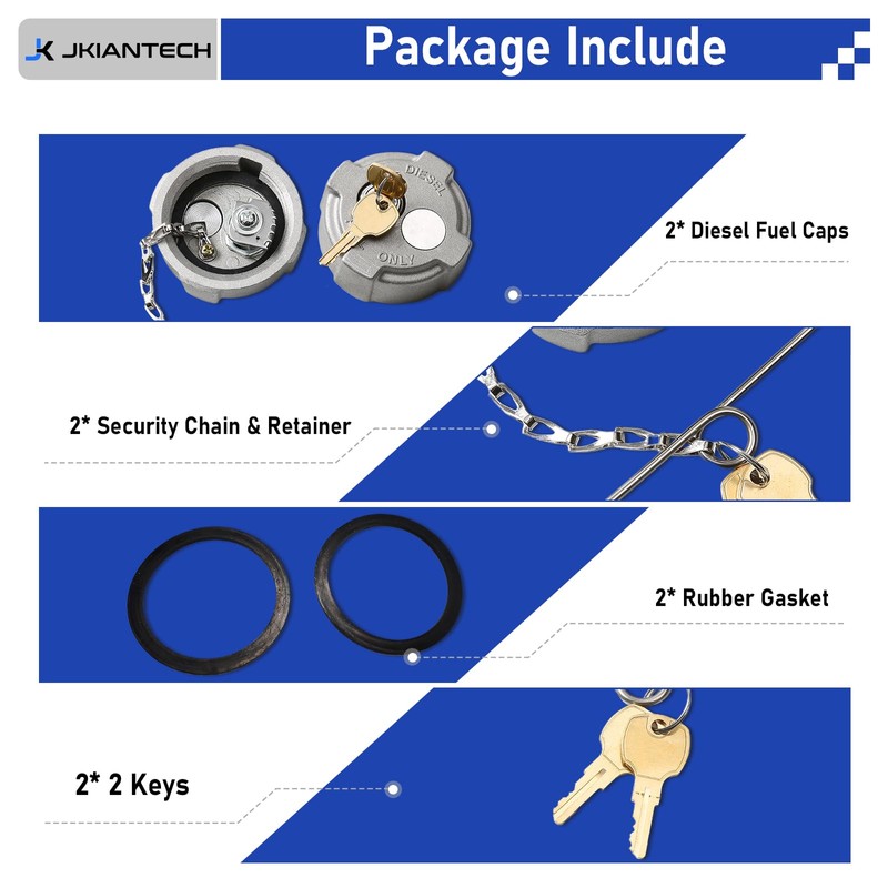- 【Attention】- The package includes 2 diesel fuel tank caps, 2 pairs of keys, 2 safety chains, 2 hang rings, and 2 rubber gaskets. It is only suitable for fuel tank filler neck O.D. (locking diesel fuel tank cap I.D.) of 2 1/4 inches, please check the size before ordering