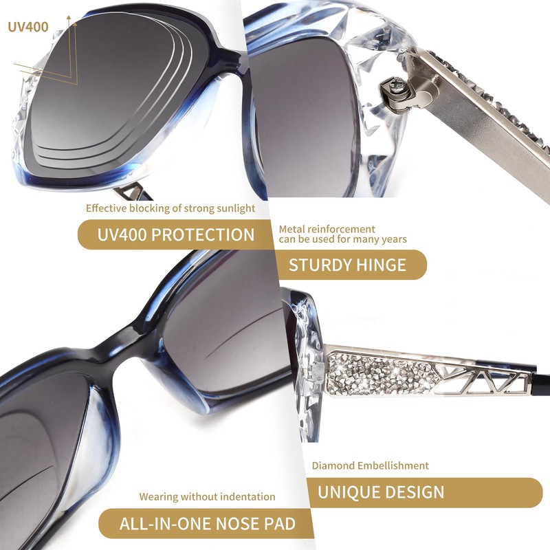 - Gradient Bifocal Lens - Our sunglasses block 100% of UVA and UVB rays, restore true color, and protect your eyes from reflected and scattered light.