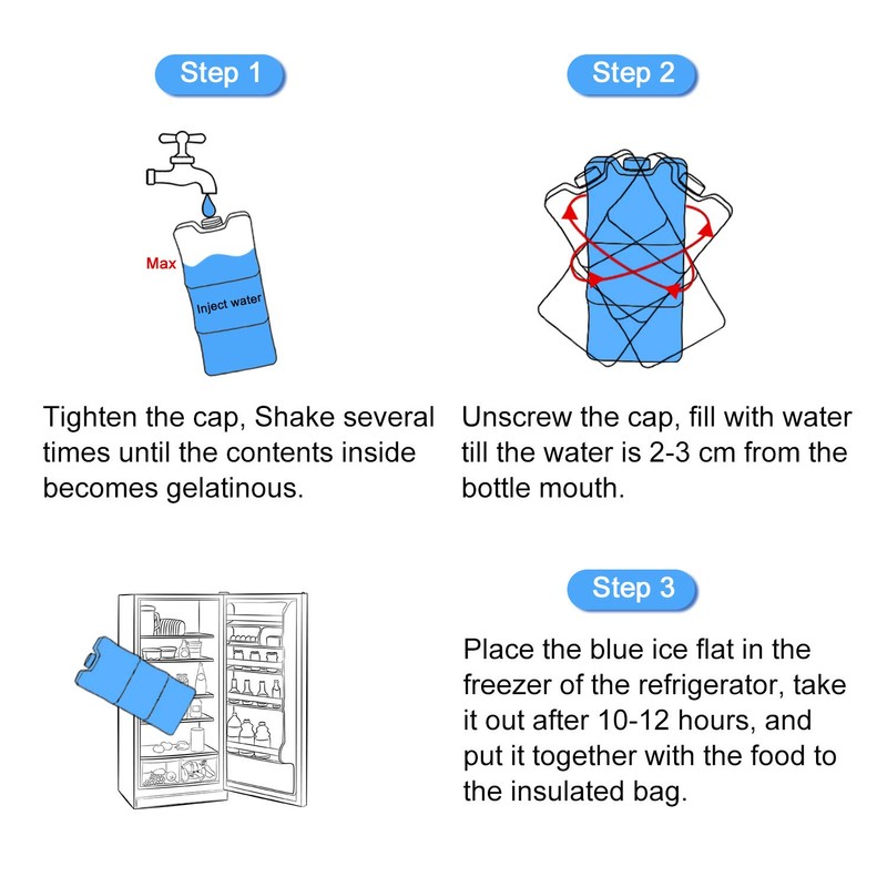 - INSTRUCTIONS: 1. Unscrew the lid, pour water to the recess of the top wave of the box, and gently shake it for 2 minutes until it gels inside, then tighten the lid. 2. Place the ice packs flat in the refrigerator for 8-12 hours, then take it out and put it in a heat preservation bag or box with the food. 3. When not use, keep in a cool place.