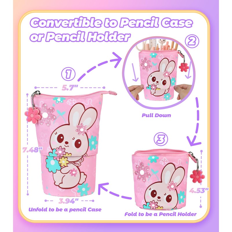 • Novelty Standing Pencil Case: With its bright and cheerful design, decorated with colorful blossoms, and an adorable bunny, this pencil case is both cute and eye-catching. Its fun design is perfect for kids, making it a delightful companion for school or creative activities