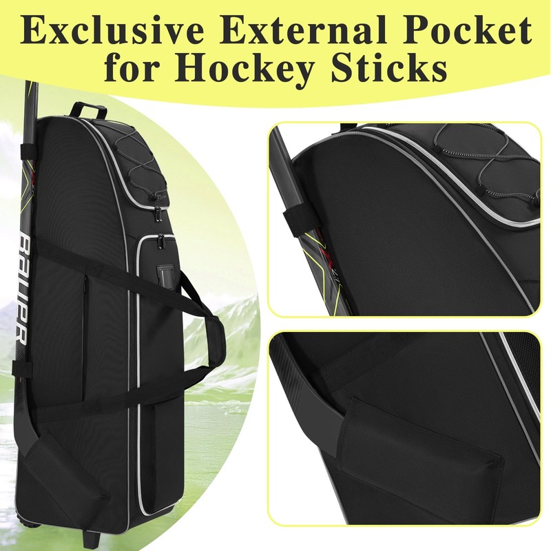 - 【Hockey Duffle Bag with Rollers】:The duffle bags with rollers is equipped with smooth and durable rollers, which greatly reduces the burden of carrying. In addition, the hockey bag comes with a carrying strap, gives you the option to carry this bag in other ways.Note: This bag can't stand on its own. Purchase with caution
