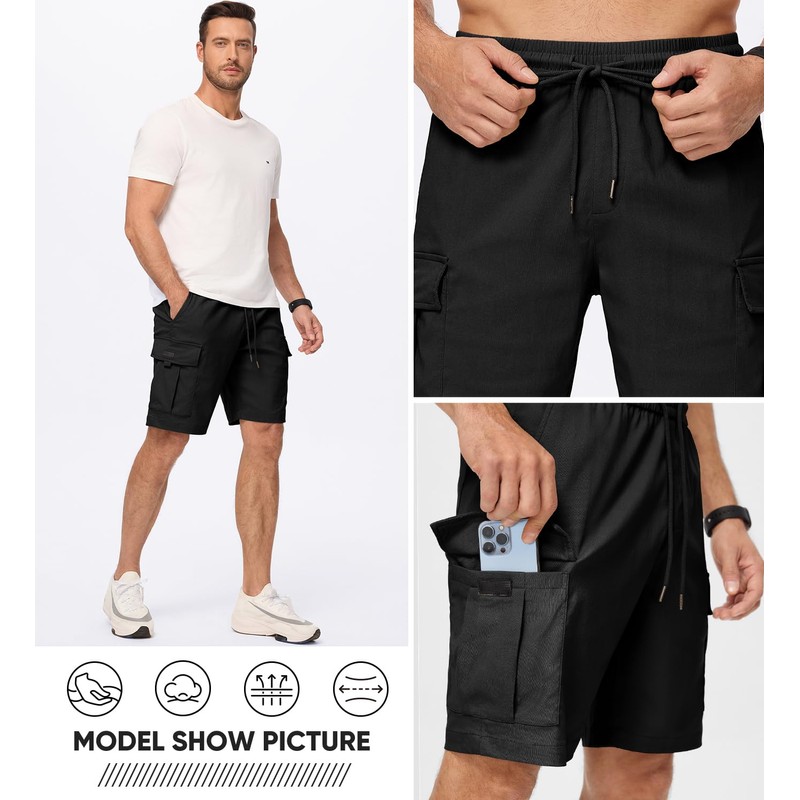 Product FeaturesVersatile Design: These cargo shorts bring a classic and casual style to your wardrobe, suitable for various occasions such as work, travel, or everyday wear.Comfortable Fit: The elastic waist with drawstring allows for a customizable and comfortable fit, making it easy to move around throughout the day.Functional Pockets: With multiple pockets, these cargo shorts provide ample storage space for essentials like keys, wallet, and phone, keeping your hands free.Quality Materials: Made from a cotton blend fabric, these shorts are durable, breathable, and easy to care for, ensuring long-lasting wear.Usage ScenariosWork: These cargo shorts are perfect for casual work environments where comfort and functionality are key.Travel: Ideal for traveling, the multiple pockets make it easy to carry travel essentials while staying comfortable on the go.Leisure: Whether you're running errands or hanging out with friends, these cargo shorts offer a stylish and practical option for your everyday activities.With its versatile design, comfortable fit, and functional features, the JMIERR Mens Casual Stretch Cargo Shorts are a must-have item for any man's summer wardrobe. Perfect for work, travel, or leisure, these shorts offer both style and practicality in one. Elevate your look with these classic cargo shorts today!