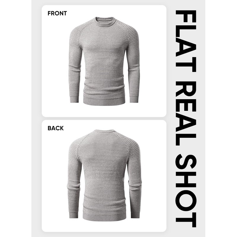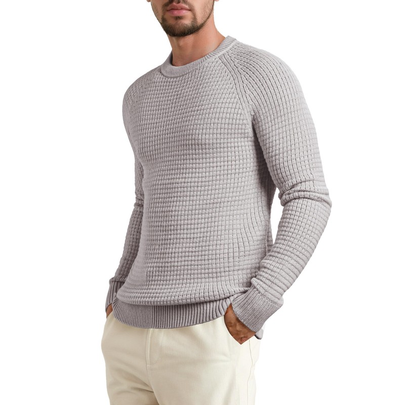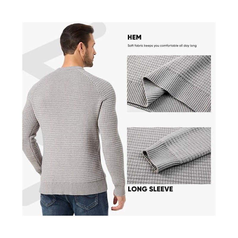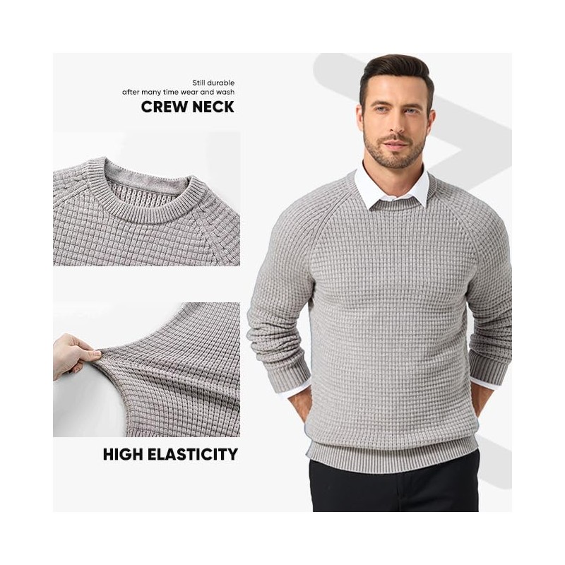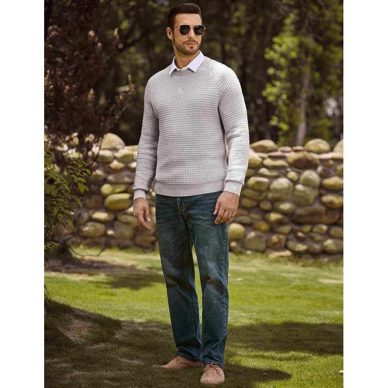 JMIERR Mens Textured Waffle Knitted Crewneck Sweater Checked Plaid Solid Pullover Soft Comfortable Casual Daily Wear Top, US 38(S), Light Grey
