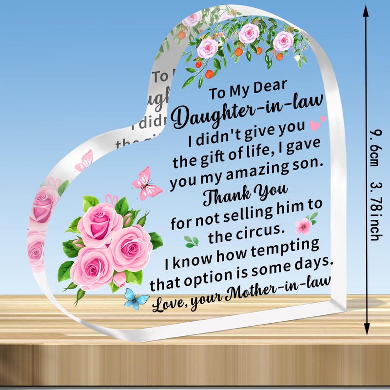 JMIMO Daughter in Law Gifts, Daughter in Law Birthday Gifts Wedding Christmas Heart Shaped Acrylic Plaque Gifts for Daughter in Law From Mother In Law - I Gave You My Amazing Son