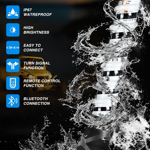 【ROCK SOLID DESIGN】ATV LED Whip Lights is covered by EVA transparent heat shrink tube and high-toughness silicone to protect the LED chip from water and dust while providing excellent flexibility and shock-proof mechanism, thus improving the durability of the product. IP67 waterproof rating, excellent heat dissipation, and rugged LED, RGB whip light life exceeds 50,000h.