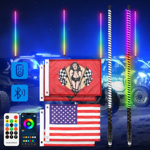 2x 3FT COB LED RGB Spiral Chasing Whip Lights+Remote +Flags +Springs For ATV UTV