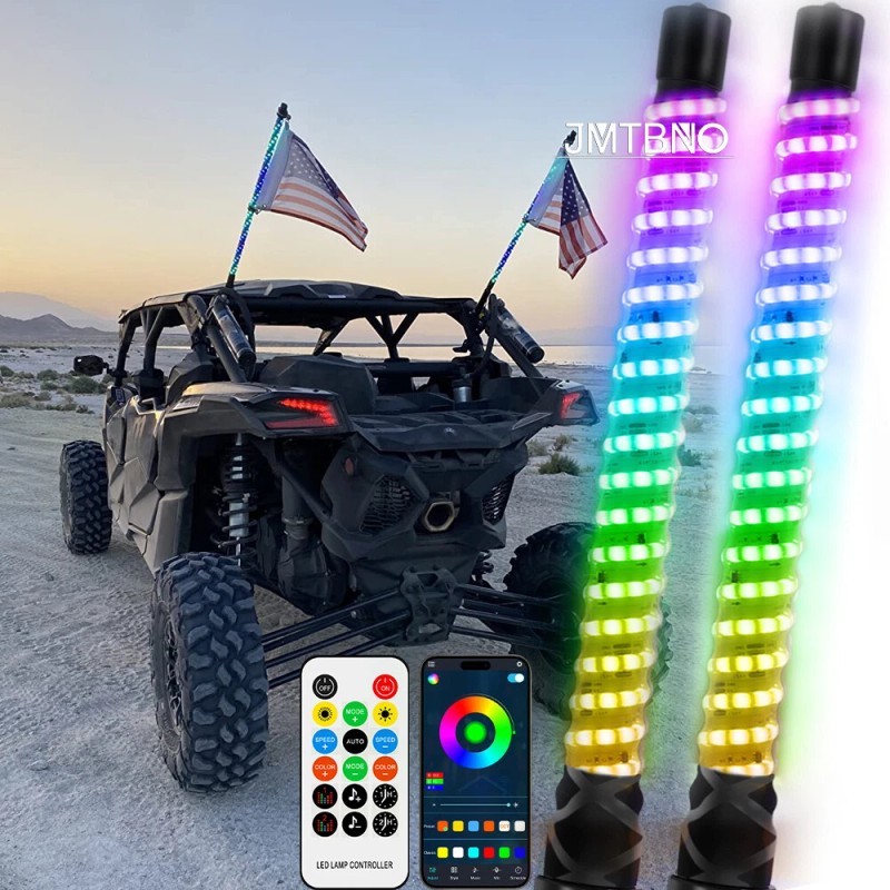 JMTBNO 2x 3FT COB LED RGB Spiral Chasing Whip Lights+Remote +Flags +Springs For ATV UTV