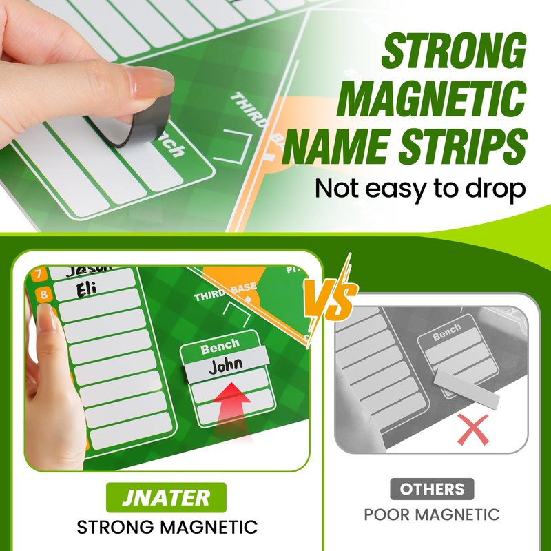 - 【ULTIMATE COACHING TOOL】-JNATER magnetic baseball lineup board is the perfect tool for coaches to strategize and communicate with your team during practices and games. Come with 30 removable powerful magnetic lineup cards, you can make real-time adjustments to the lineup and keep track of player positions.