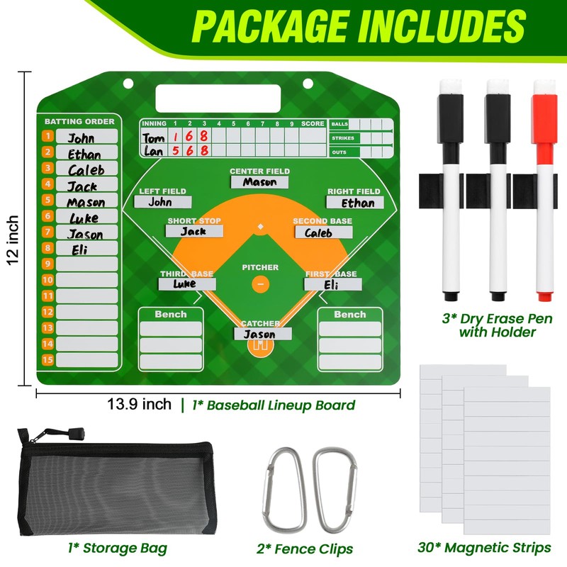 - 【WHAT YOU GET】 -1*Magnetic baseball lineup board, 30*Lineup Cards, 3*Dry Erase Pens with holder, 2*Hooks, 1*Storage Bag for easy storage dry erase pens, lineup cards and more. Get your baseball magnetic lineup board today and draw up the next winning play!