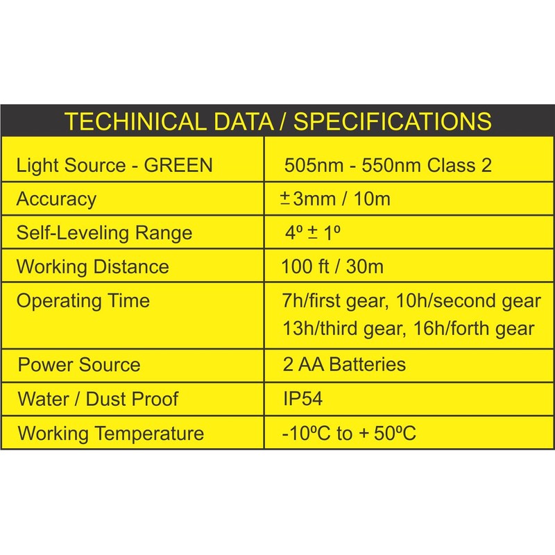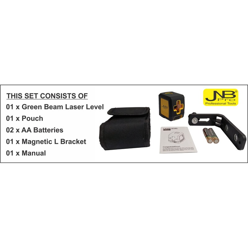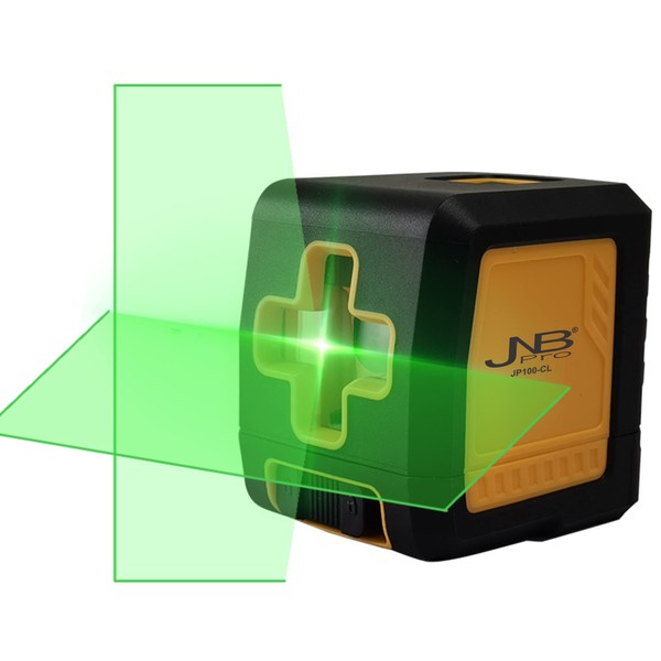 The JNB Pro Cross Line Green Beam Laser Level is designed for precise alignment in indoor and outdoor settings. With a visibility range of up to 100ft/30m, it features a self-leveling function for surfaces within 4°, flashing a warning if out of range. Adjustable brightness levels (100%, 75%, 50%, 25%) provide up to 16 hours of operation using two AA batteries. Built for durability, this compact 3''x3''x2.5'' laser level is fall, water, and dust-resistant. It comes with a magnetic bracket, a craftsman tool bag for convenient transport, and batteries included—making it an essential tool for straight-line tasks and professional projects.