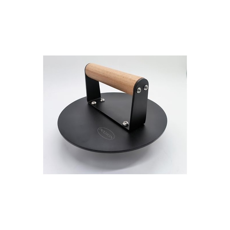 • Heavy duty iron oversized Flat press, easier to clean than the ones with grooves/lines. Wood handle never gotten hot when using.