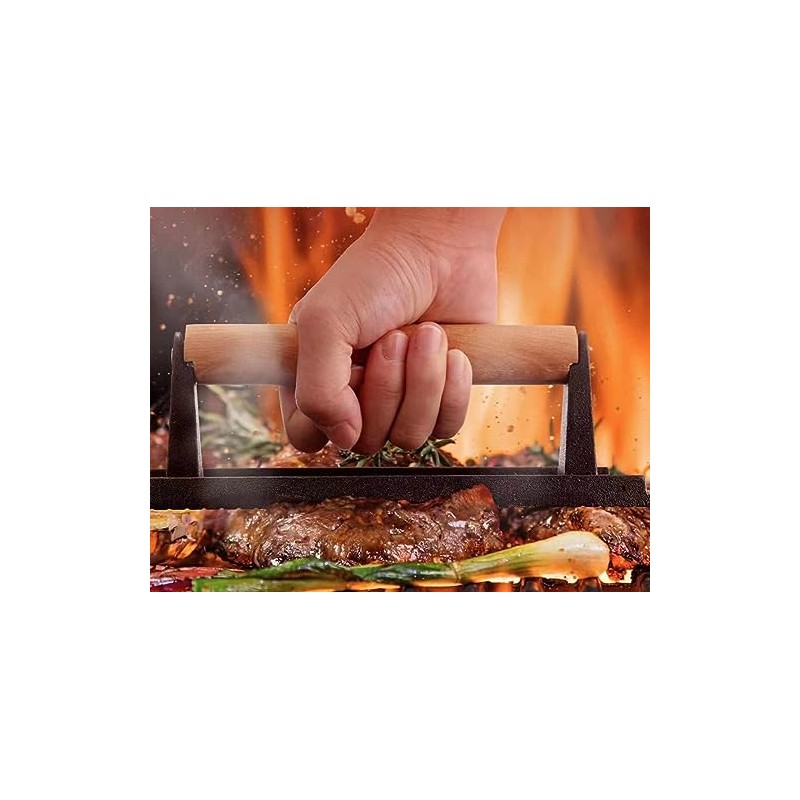 Heavy duty iron oversized eheat the barbecue weight on the grill, then place it on burgers, bacon, ham, grilled sandwiches, burgers, panini, pork ribs, corn tortillas, etc; Helps to evenly cook meat from both sides and speeds up cooking time.