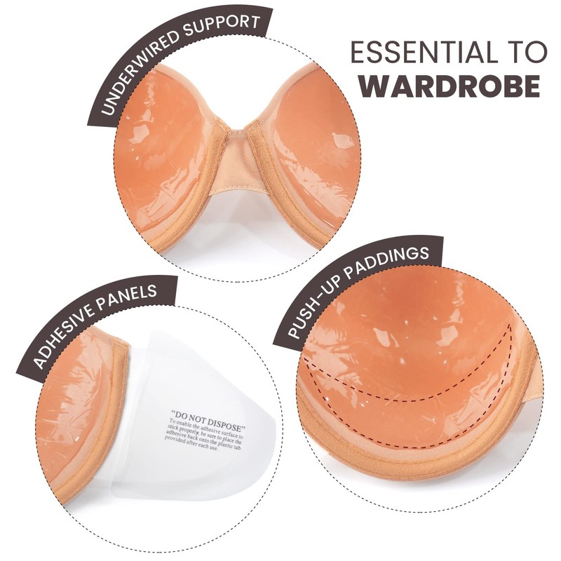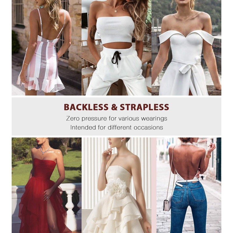 - Backless & Adhesive --- Backless and strapless design with adhesive side tapes help to keep in place and stay put. Get your back free.