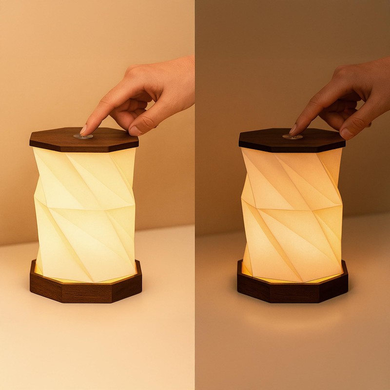 - Foldable origami style design with waterproof paper texture and walnut wood. Compact and decorative, fits any modern or minimalist ambience.