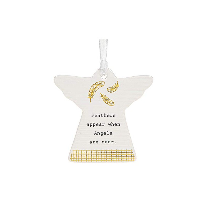 • I am offering for sale a charming ceramic Guardian Angel hanging sign decorations from Thoughtful Words. Each of the angels have a rippled surface with black and gold wording and decorations. Great gift for family or friends or just to a lovely decoration to hang around the home with the white ribbon attached. Each guardian angel has beautiful sentimental words, fitting for many occasions. Each decoration comes boxed and it's always comforting to know that you have an angel looking over you.