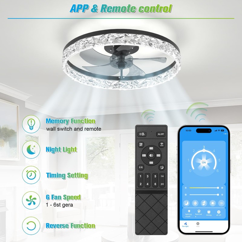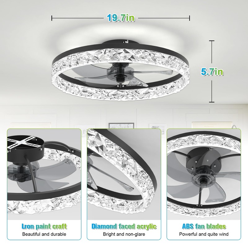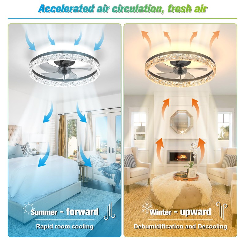 - [Modern Ceiling Fan] Bladeless ceiling fans with lights eschew big bukly blades, more lightweight and delicate. Crystal looking circumference refract more light, which can perfectly adapt to various furniture styles and give your house an upgraded look.In addition, modern smart ceiling fans with lights can be controlled not only by wall switch, but also by remote control and APP, smart home, convenient life.