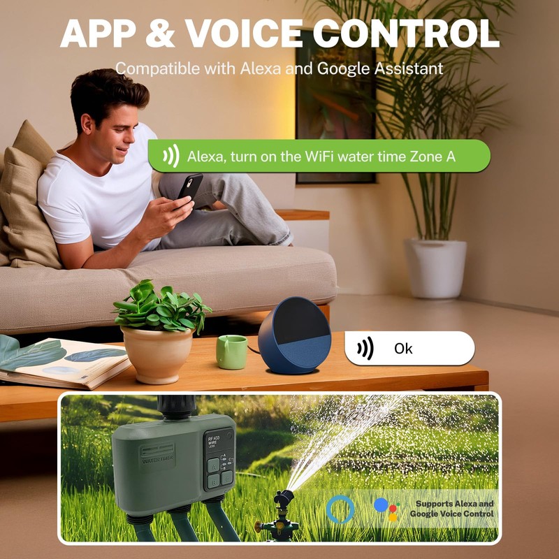 • Smart intelligent irrigation system: simply connect the 3-zone WiFi irrigation computer to the 2.4 GHz WiFi, you can easily program the watering timer and manage your watering plan anytime and anywhere via the Smart Life app (Android, iOS) In the Smart Life / Tuya app, you can also control it via voice control with Alexa and Google Assistant