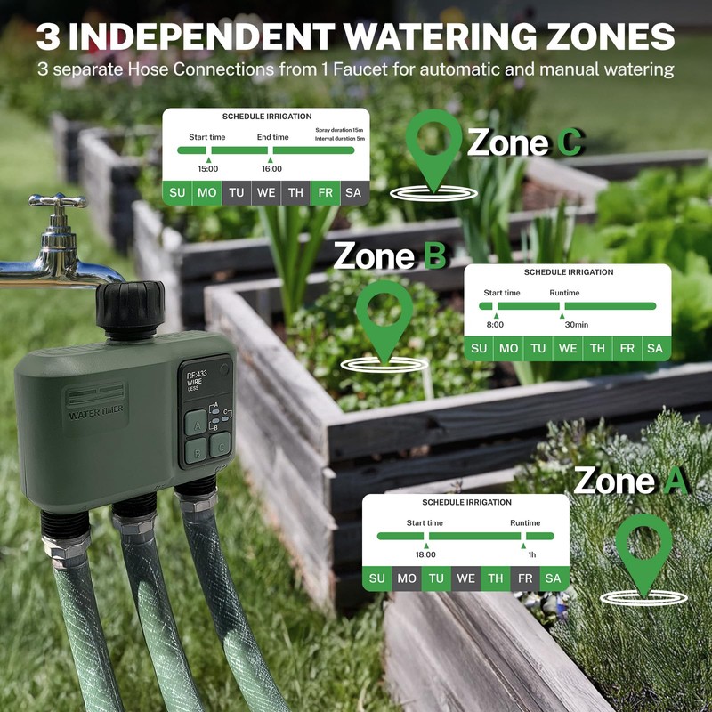 • 3 independently programmable outputs: flexible watering settings can be adjusted via 3 zones. Ideal for watering lawns, vegetables and other plants. You can program your different needs via 3 different hoses and settings on the same day to save energy