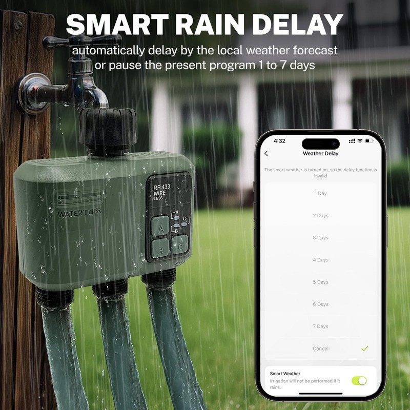 • Intelligent weather-dependent irrigation: intelligent rain delay. The WiFi irrigation computer has a rain delay function, which can be manually set to 1-7 days. In addition, the timer uses real-time weather forecasts to automatically adjust the watering schedule, helping you save water every month.